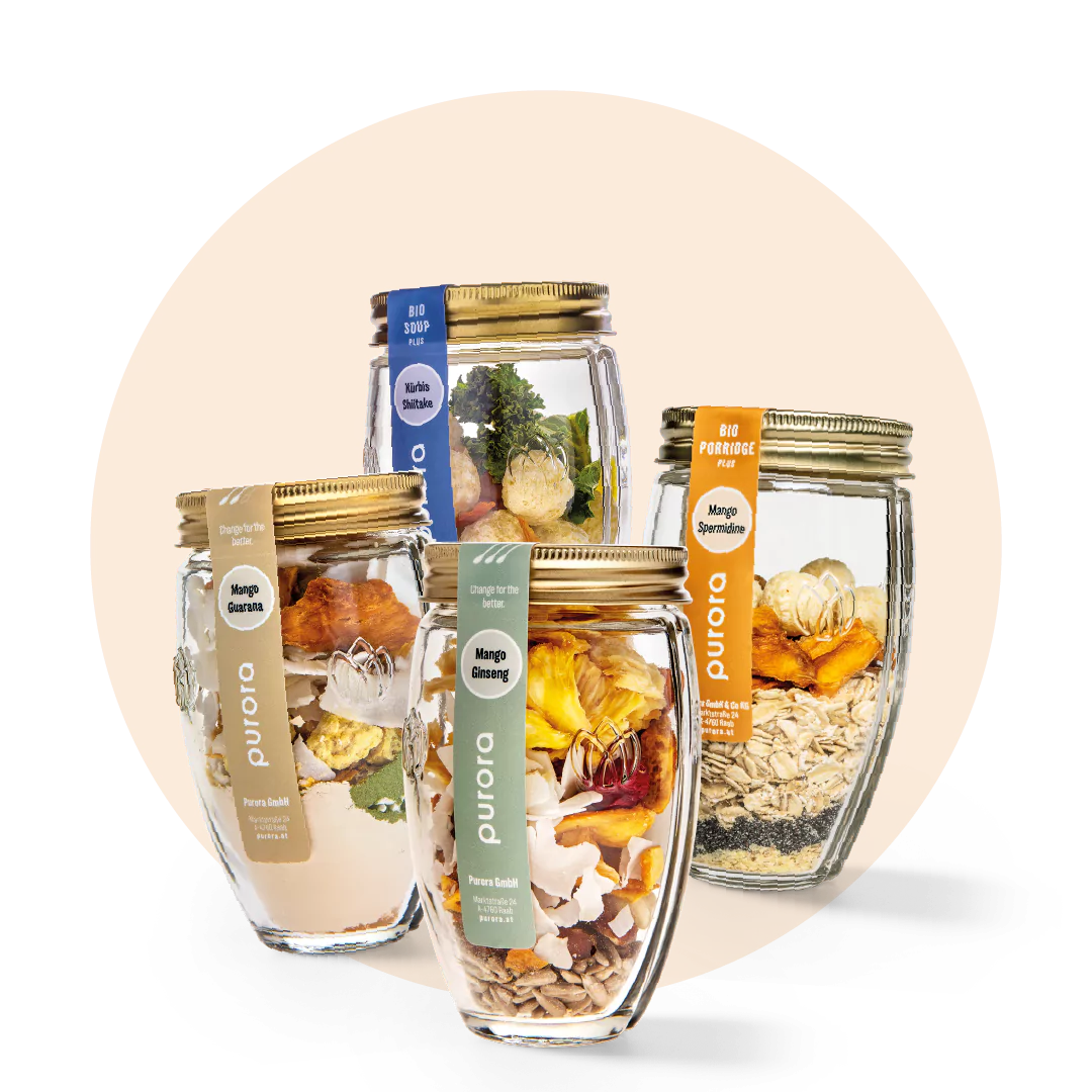 Purora hilft dir, gesunde Routinen einfach in deinen Alltag zu bringen – mit Premium-Mahlzeiten aus natürlichen Bio-Zutaten und kraftvollen Superfoods, reich an essentiellen Nährstoffen. Du bereitest sie im ThermóTwist in wenigen Minuten warm zu oder mixt sie selbst frisch nach dem Rezeptbuch. So sparst du Zeit und gibst deinem Körper genau das, was er braucht. Ergänzt wird das Sortiment durch Snacks, Toppings, Elixiere und wertvolles Wissen für mehr Energie und Lebenskraft.