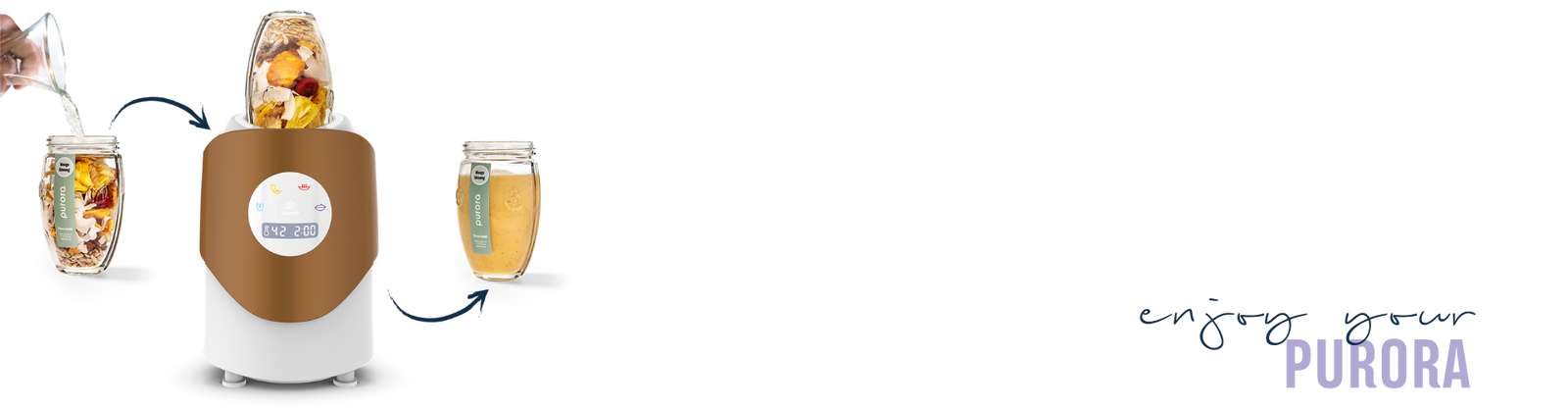 Fülle dein Purora Glas mit Wasser, Milch oder einem Pflanzendrink deiner Wahl. Setze den Mixkopf mit einem Handgriff auf - bereit für die volle Entfaltung der Nährstoffe.