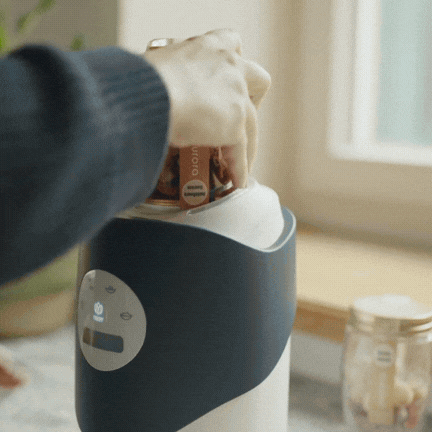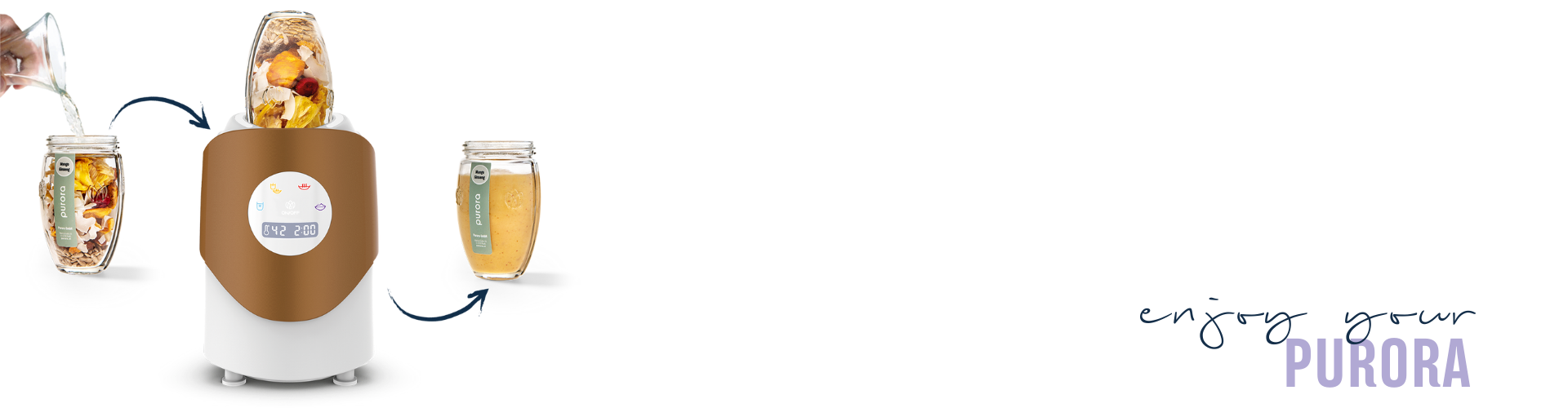 Fülle dein Purora Glas mit Wasser, Milch oder einem Pflanzendrink deiner Wahl. Setze den Mixkopf mit einem Handgriff auf - bereit für die volle Entfaltung der Nährstoffe.
